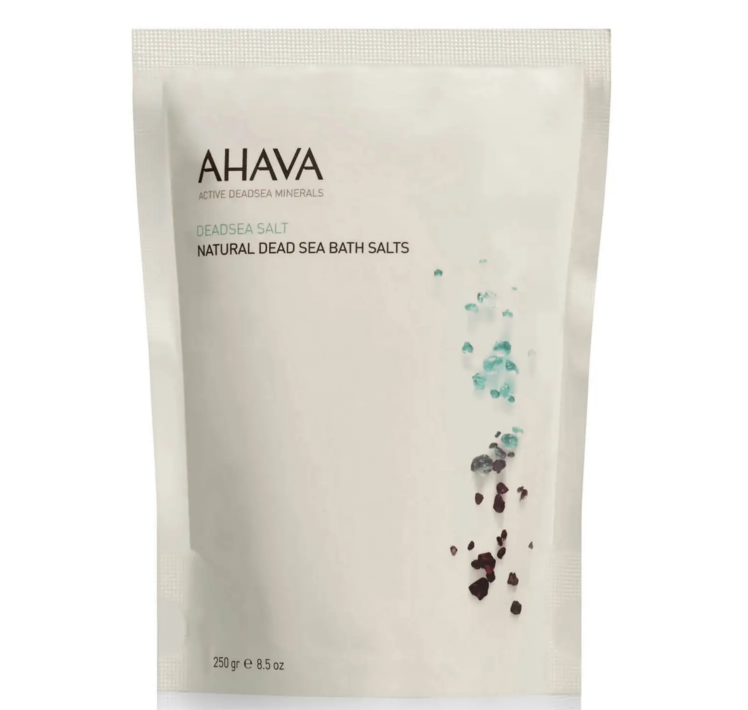• Pacote de sais de banho naturais do Mar Morto da marca AHAVA em embalagem branca minimalista.