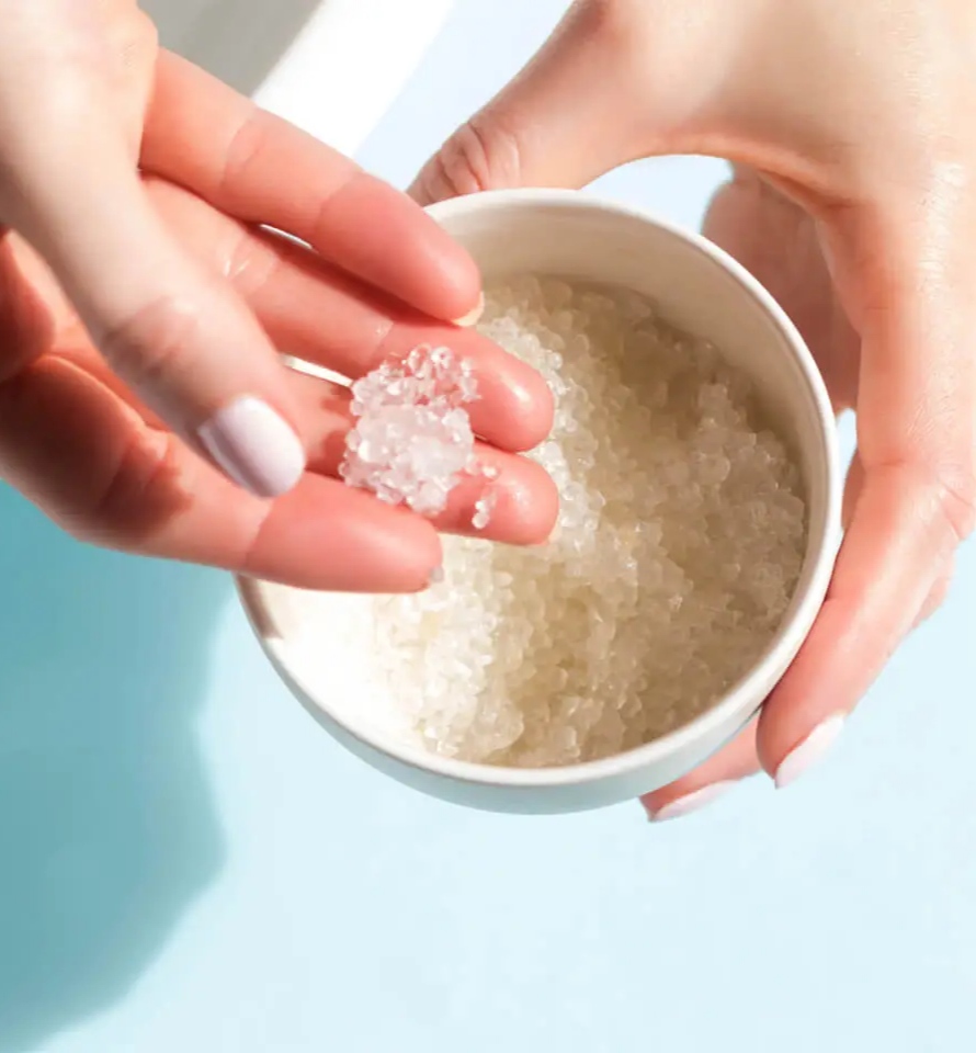 • Cristais granulados em recipiente branco nas mãos femininas