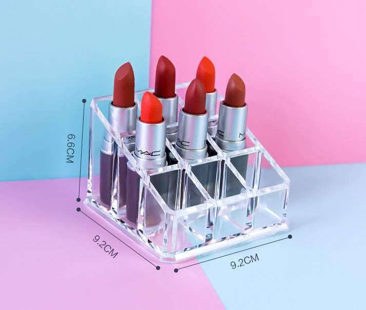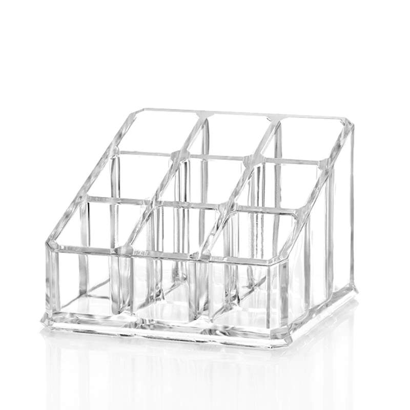 Organizador de maquilhagem transparente em acrílico com nove compartimentos.