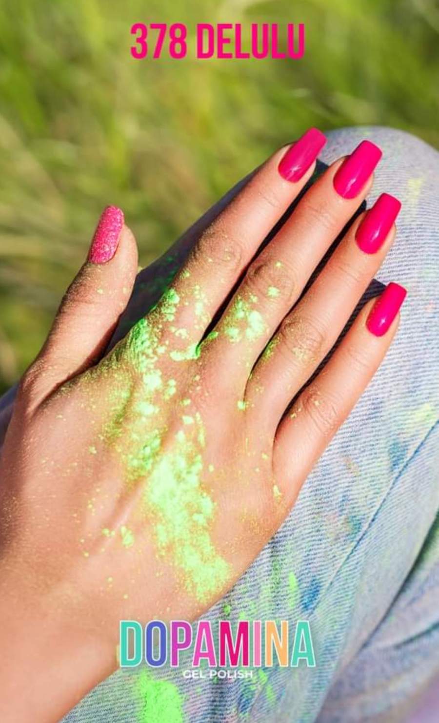 • Mão com unhas rosa vibrante e glitter com pó verde fluorescente, texto '378 DELULU' e 'DOPAMINA GEL POLISH'.